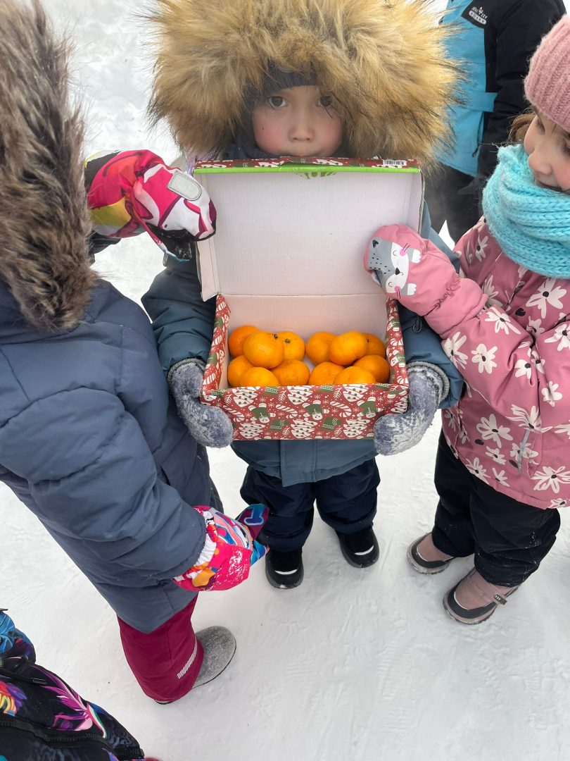 ❄️ По окончании каждого задания дети получали часть снежинки. Когда все части были собраны, на обратной стороне дети увидели схематичное изображение ёлки. Тогда все и догадались, где спрятано сокровище, а в коробке детей ждали мандарины.🍊