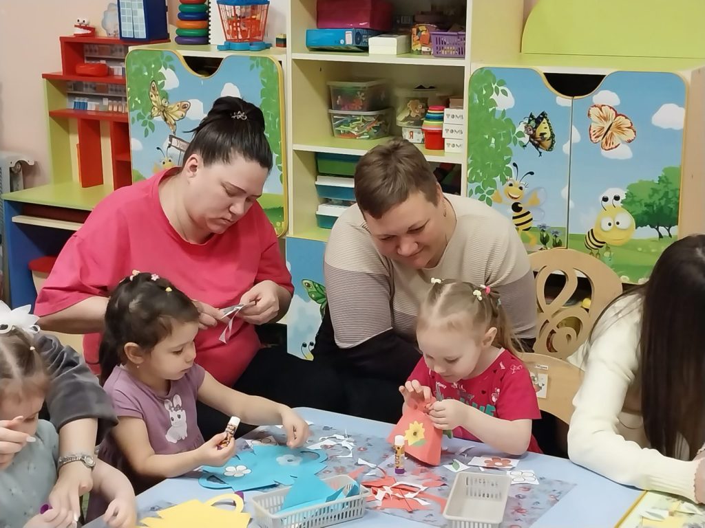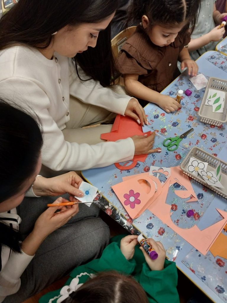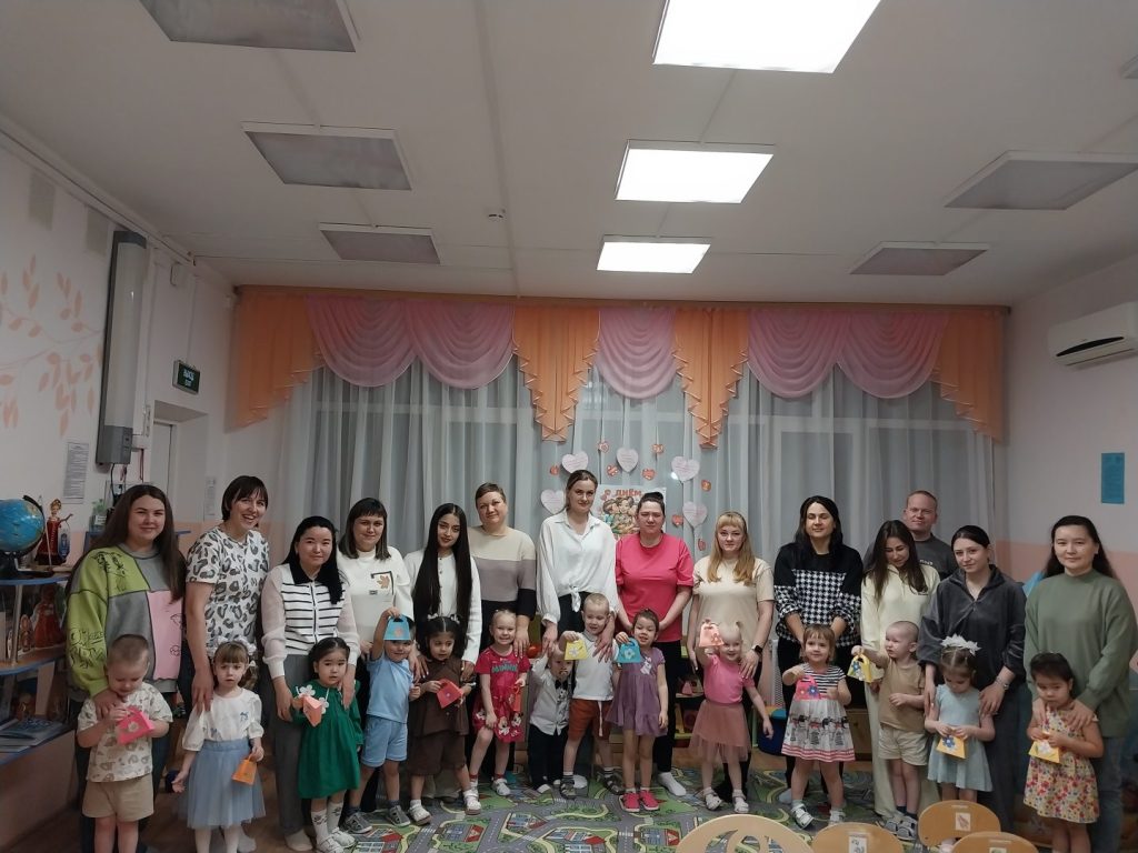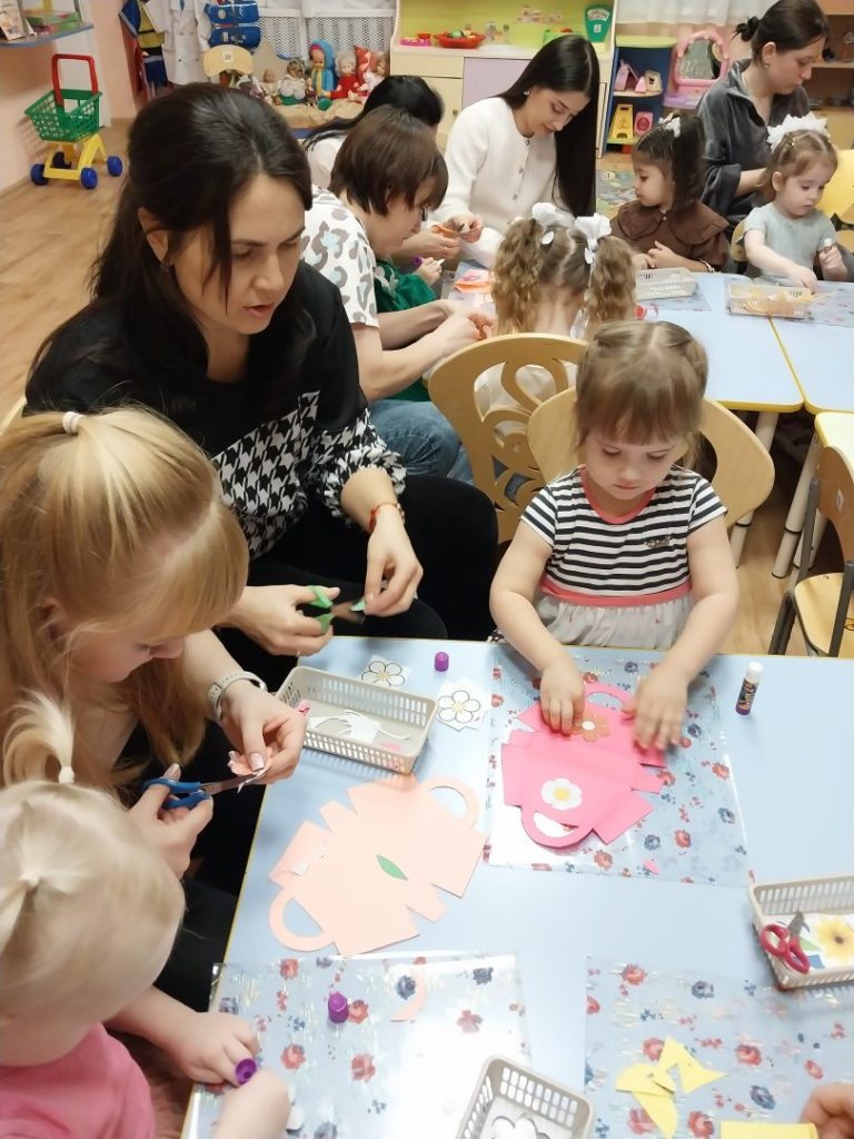 Но какой праздник без подарка? Самой творческой частью нашего вечера стал мастер-класс, где малыши вместе с мамами создали красивые нарядные сумочки из бумаги. Это был не просто сувенир, а настоящий символ совместного труда и любви, который мамы бережно забрали с собой.