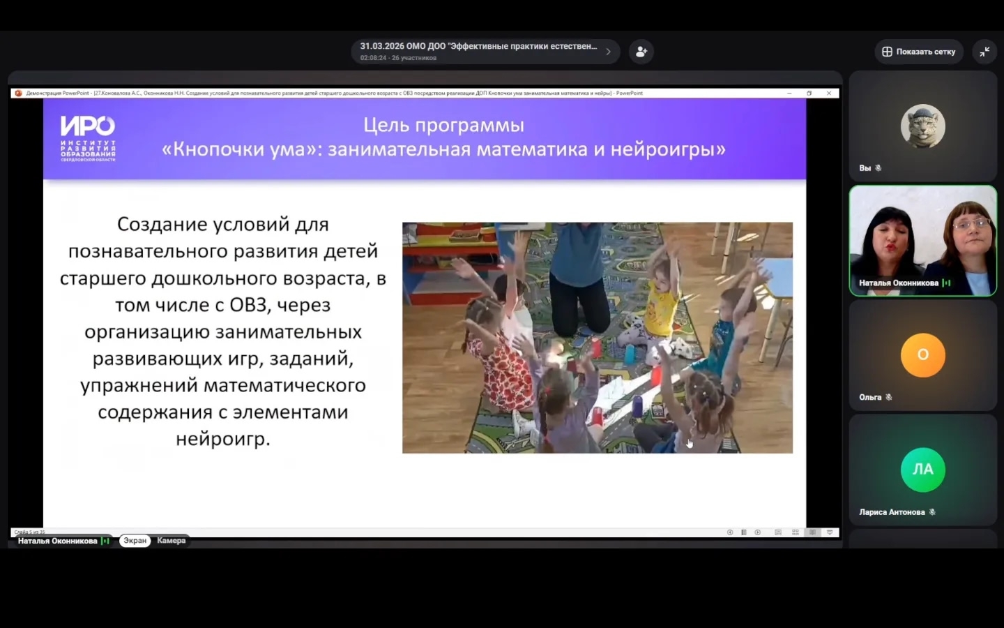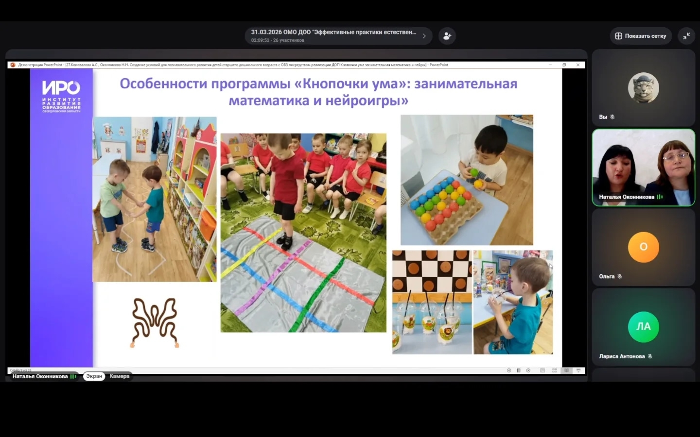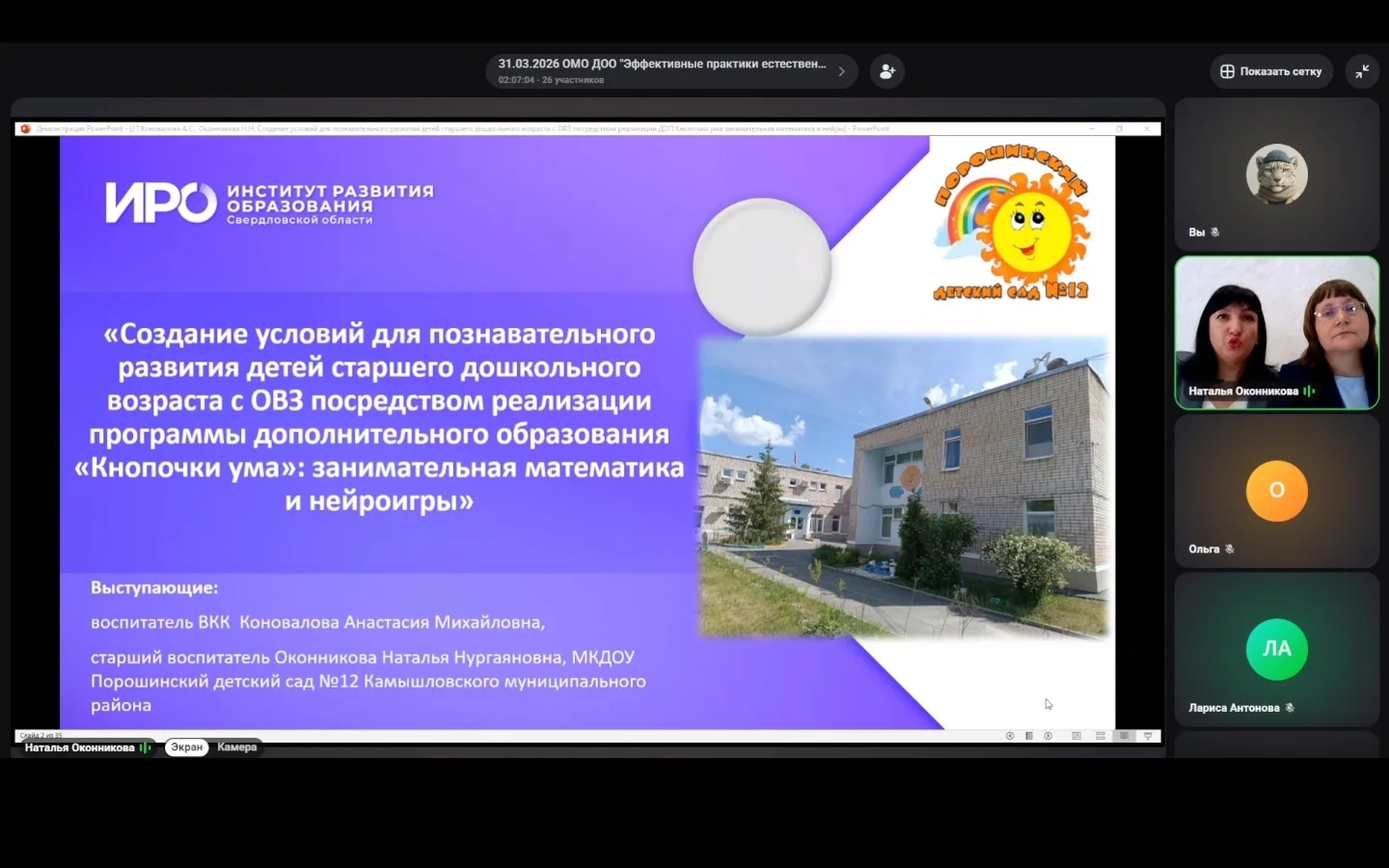 Сегодня воспитатель Коновалова Анастасия Михайловна и старший воспитатель Оконникова Наталья Нургаяновна приняли участие в областном методическом объединении педагогов дошкольных образовательных организаций Свердловской области «Эффективные практики, современные образовательные технологии естественно-научной, математической образовательной среды развития ребенка, в том числе, во взаимодействии с социальными партнёрами».