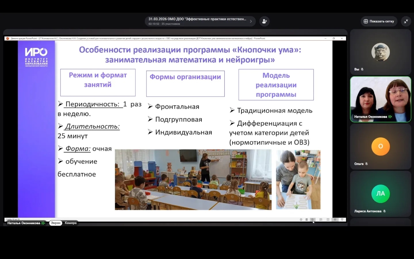 Ключевая особенность организации образовательного процесса заключается в том, что происходит одновременное использование разных форм в рамках одного занятия: пока одна часть детей выполняет письменные математические задания индивидуально, другая часть занимается на нейродорожках или работает с педагогом индивидуально.