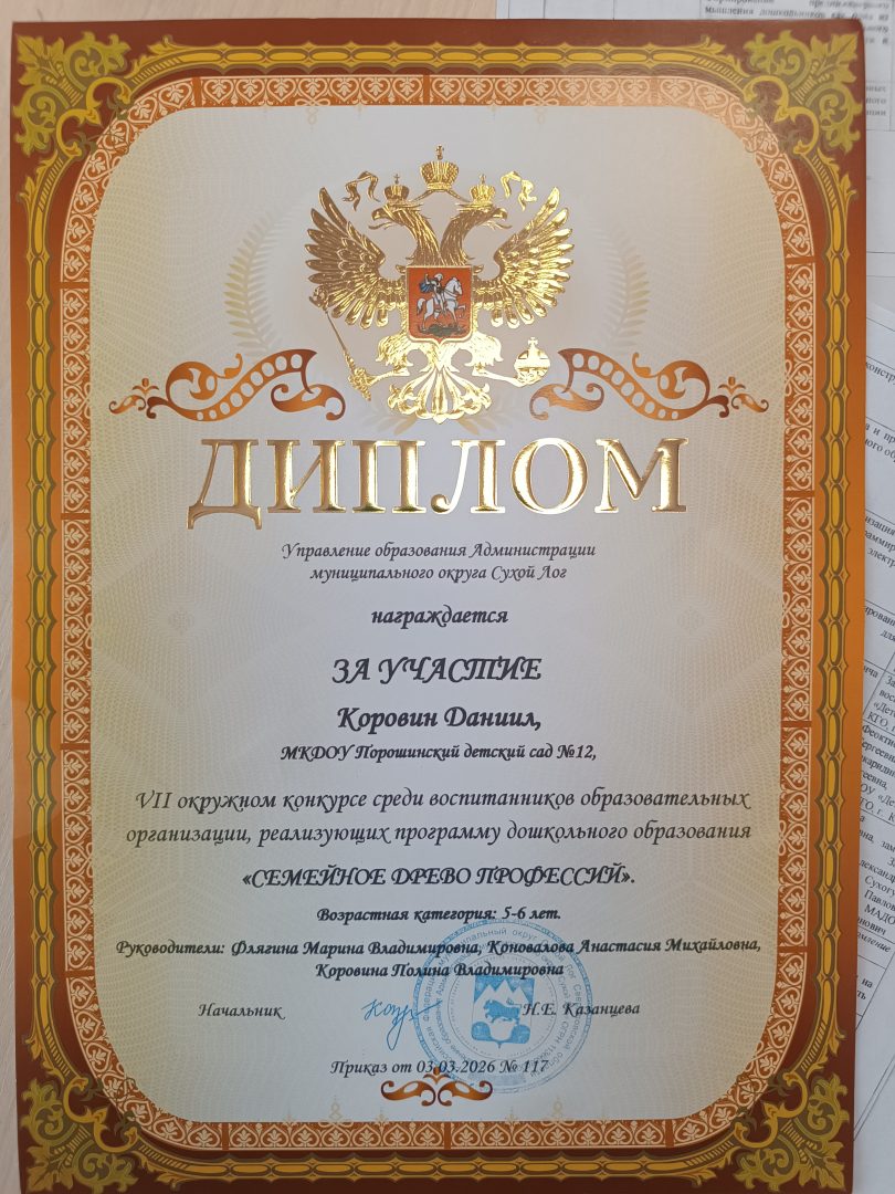 12 марта в городе Сухой Лог на базе МАДОУ №43 «Малыш» прошел VII окружной конкурс «Семейное древо профессий» среди воспитанников образовательных организаций. Цель конкурса, по отношению к юным участникам, популяризация семейных профессиональных династий, через создание семейного древа профессий. 🏆В конкурсе от нашего детского сада участие приняла семья Даниила Коровина, воспитанника старшей группы №1. Даниил, при поддержке родителей и воспитателя группы, представил творческий проект «Семейное древо профессий» в нескольких поколениях. Даниил очень достойно защитил проект, интересно в стихах представил профессии своих родителей, а так же бабушек, дедушек и поведал о том, кем хочет стать в будущем. Даниил награждён дипломом участника конкурса.